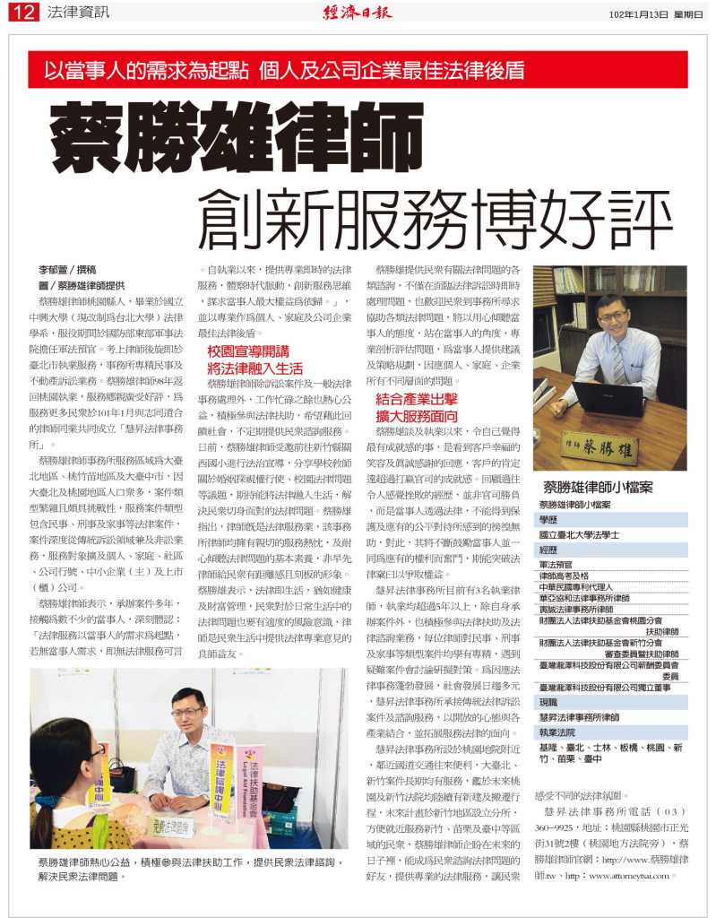 長期為大台北、桃園、新竹及苗栗等地區民眾提供法律服務2014-04-12